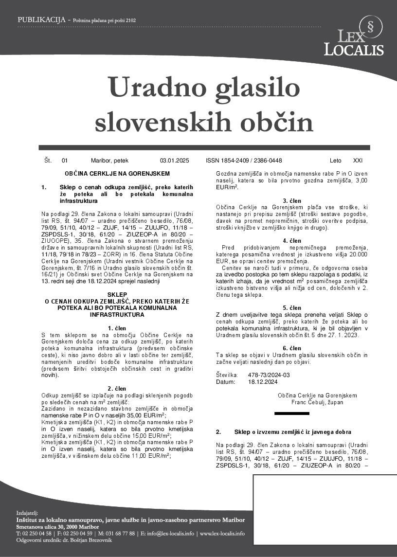 Sklep o cenah odkupa zemljišč, preko katerih že poteka ali bo potekala komunalna infrastruktura (1/2025) (Uradno glasilo slovenskih občin št. 1, 03.01.2025)