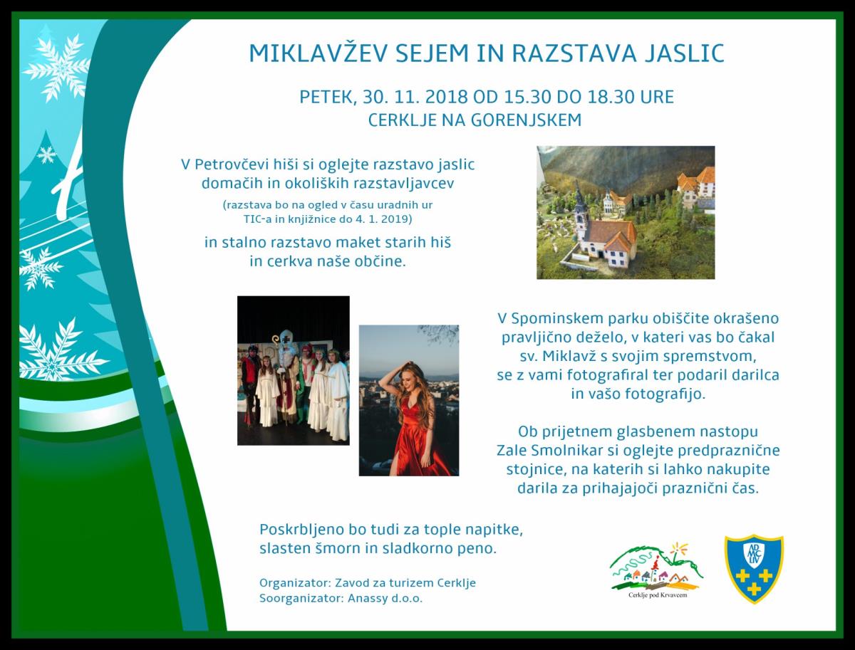 Zavod za turizem Cerklje vas v petek, 30. novembra 2018 vabi od 15.30 do 18.30 ure na Miklavžev sejem in razstavo jaslic.