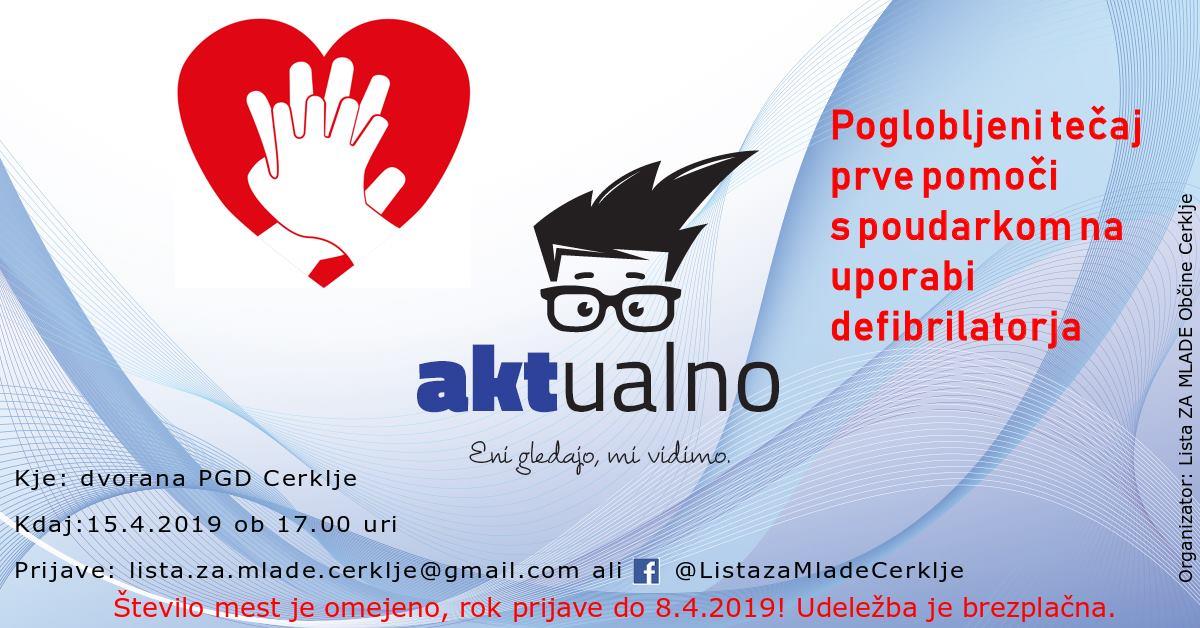 Lista za Mlade Občine Cerklje vas vabi, da se udeležite Poglobljenega tečaja prve pomoči s poudarkom na uporabi defibrilatorja, ki bo potekal v ponedeljek, 15. aprila 2019, ob 17. uri v dvorani Gasilskega doma v Cerkljah.
