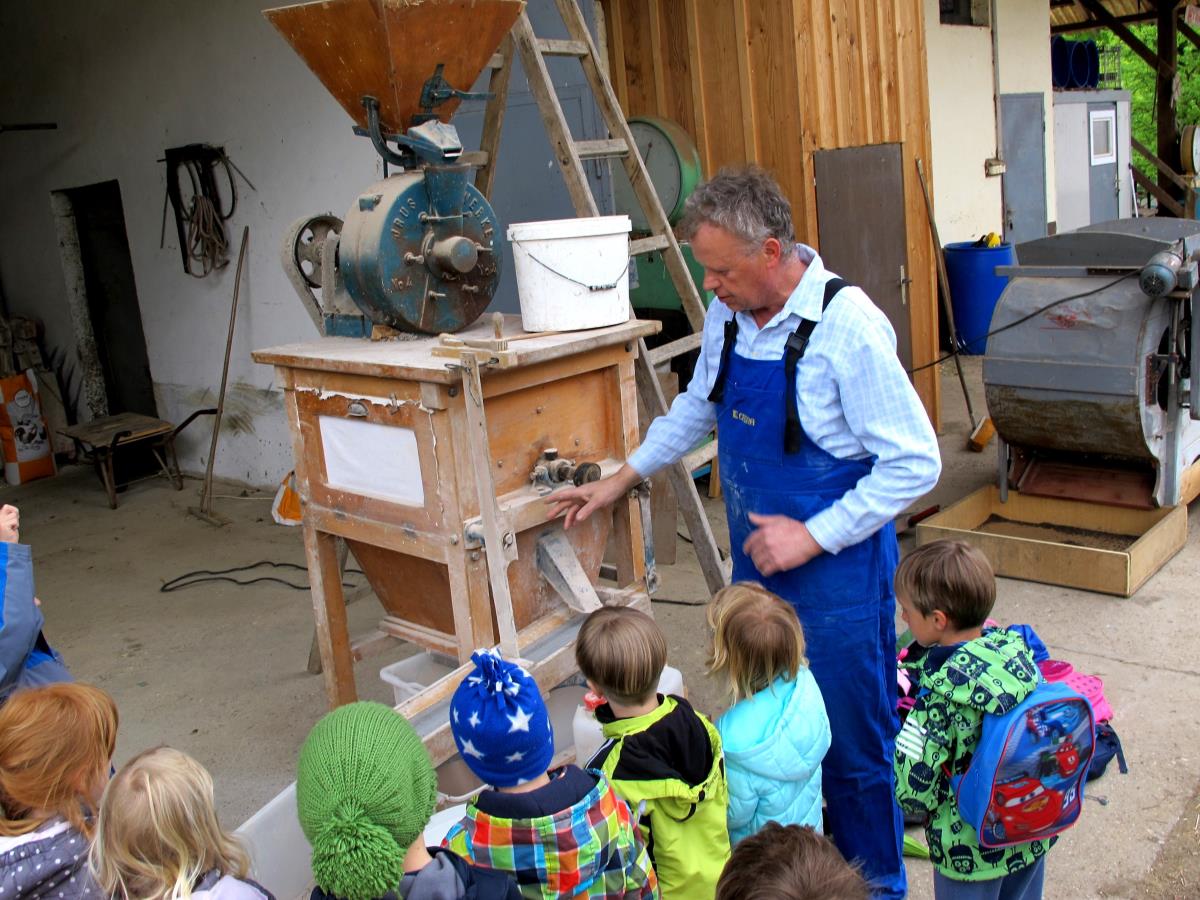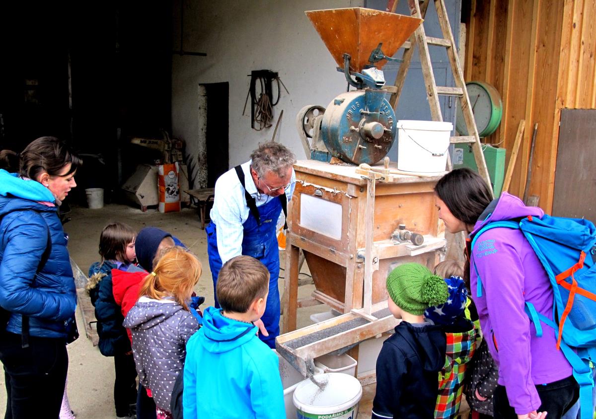 Pod kmečkim poslopjem je na starem pajkelnu gospod Ciril prikazal čiščenje ajde. Prečiščeno ajdo je nato odnesel v mlin, kjer so si otroci ogledali mletje ajde. Postopek mletja poteka z drgnjenjem dveh kamnov. Včasih so za pogon uporabljali vodo, danes pa električno napetost. Prikazal je tudi izdelovanje lesenih skled iz različnih dreves listavcev. Otroci so si ogledali tudi kmetijsko mehanizacijo in živino na sosedovi kmetiji Pr Mlač na Trati. Ob zaključku ogleda sta Jelka in Ciril s Tratarjeve kmetije vsem otrokom podarila lesene skodelice, ki jih je Ciril izdelal posebej za njih.