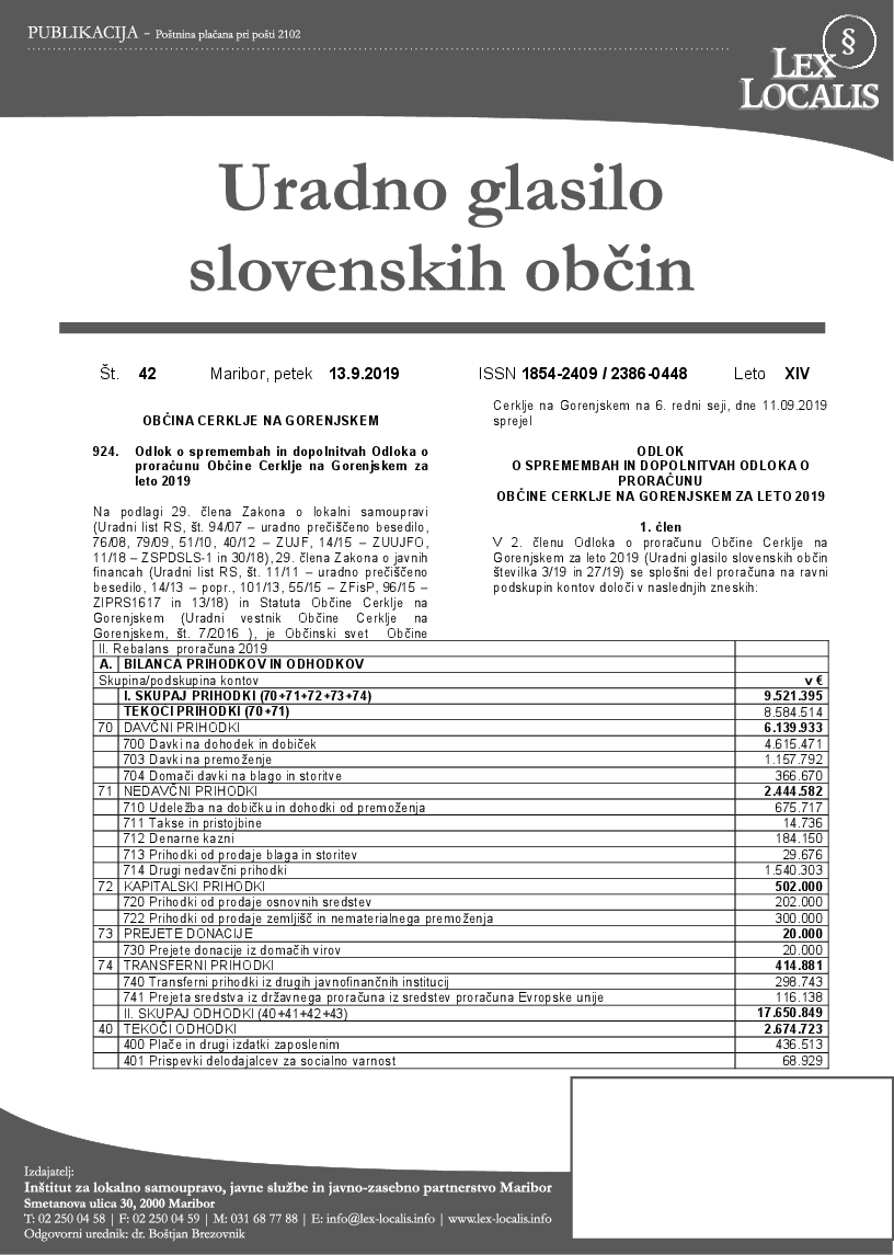 Odlok o spremembah in dopolnitvah Odloka o proračunu Občine Cerklje na Gorenjskem za leto 2019 (42/2019) (Uradno glasilo slovenskih občin, št. 42, 13. 9. 2019)