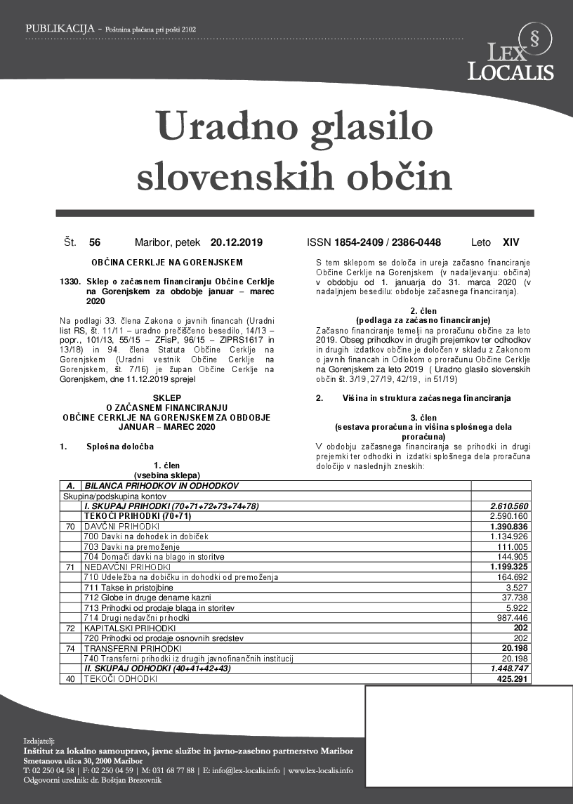 Sklep o začasnem financiranju Občine Cerklje na Gorenjskem za obdobje januar – marec 2020 (56/2019) (Uradno glasilo slovenskih občin št. 56, 20.12.2019)