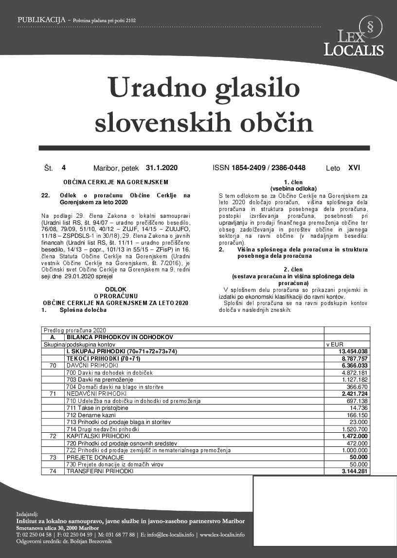 Odlok o proračunu Občine Cerklje na Gorenjskem za leto 2020 (4/2020) (Uradno glasilo slovenskih občin št. 4, 31.1.2020 )