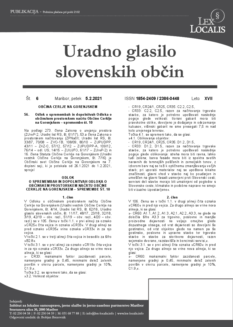 Odlok o spremembah in dopolnitvah Odloka o občinskem prostorskem načrtu Občine Cerklje na Gorenjskem – spremembe št. 10 (6/2021) (Uradno glasilo slovenskih občin št. 6, 05.02.2021)