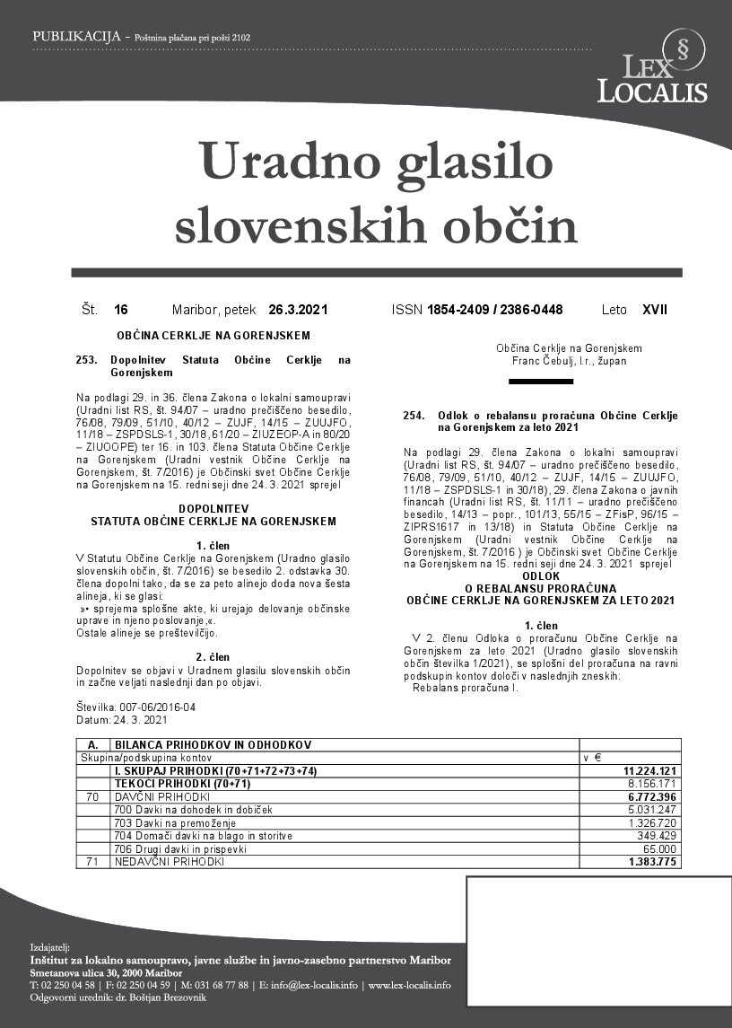 Odlok o rebalansu proračuna Občine Cerklje na Gorenjskem za leto 2021 (16/2021) (Uradno glasilo slovenskih občin št. 16, 26.3.2021)