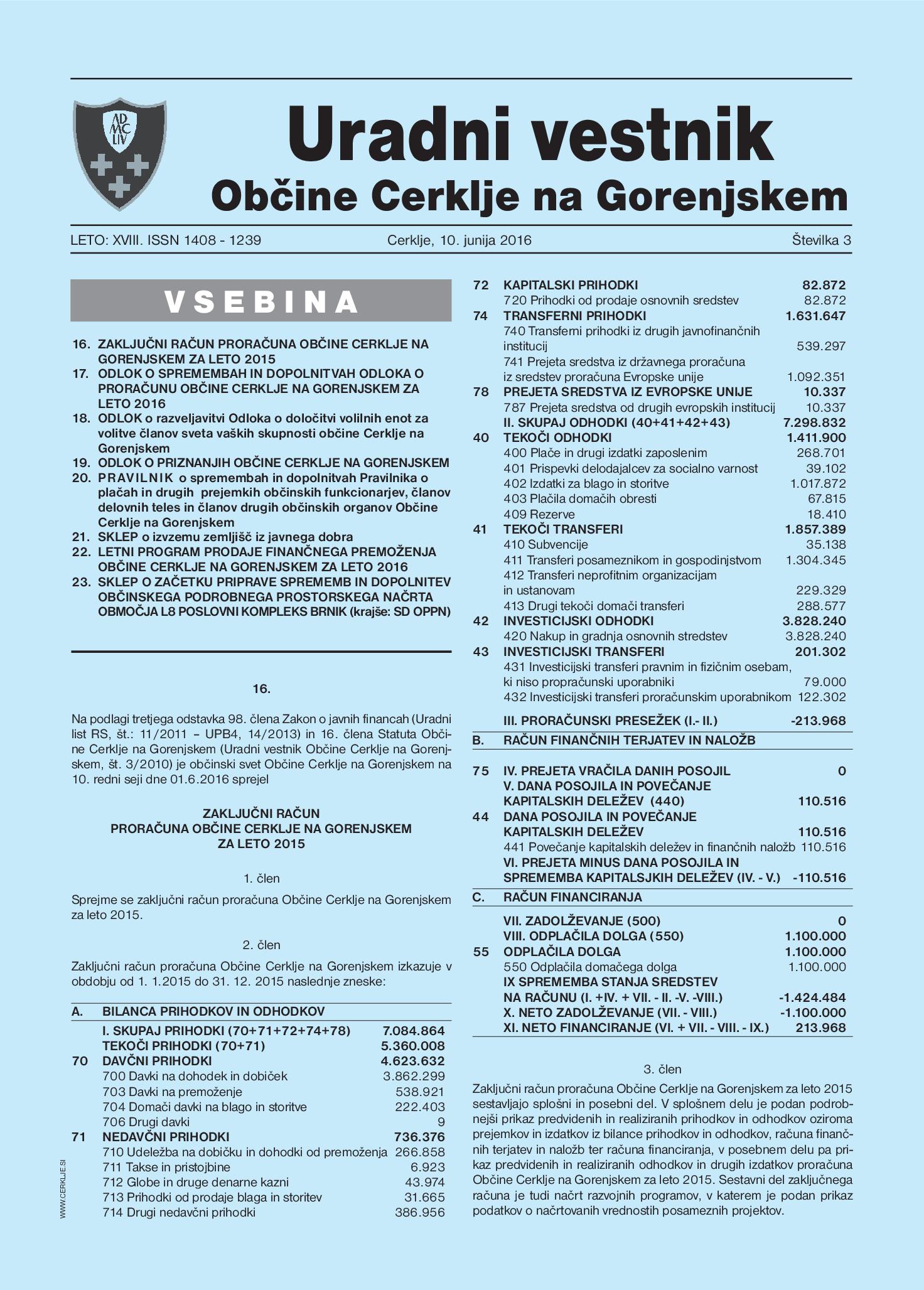 Zaključni račun proračuna Občine Cerklje na Gorenjskem za leto 2015 - UV občine Cerklje na Gor., št. 3/2016 (Uradni vestnik, Št. 3, 10. junij 2016)