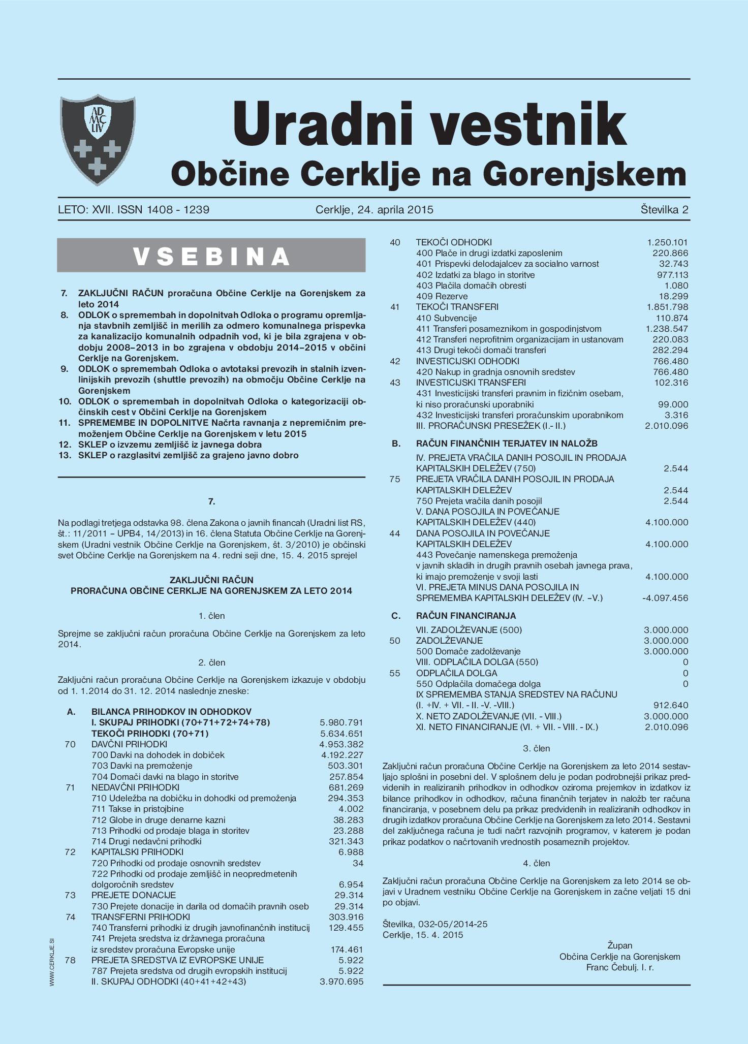 Zaključni račun proračuna Občine Cerklje na Gorenjskem za leto 2014 - UV občine Cerklje na Gor., št. 2/2015 (Uradni vestnik, Št. 2, 24. april 2015)