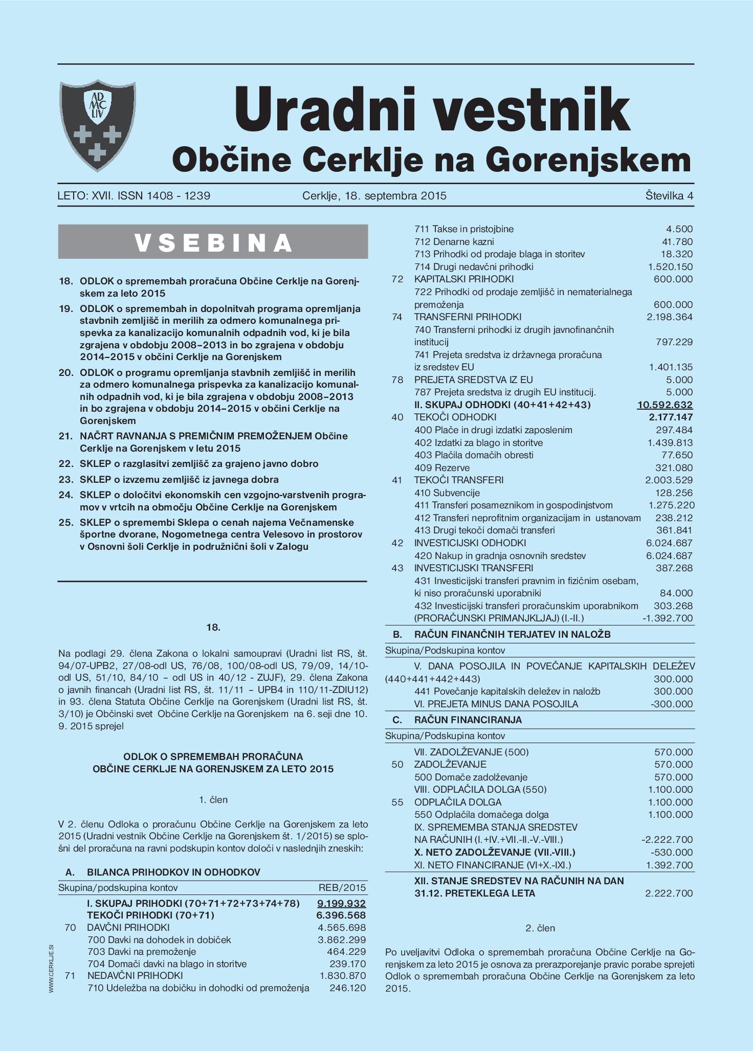 Odlok o spremembah proračuna Občine Cerklje na Gorenjskem za leto 2015 - UV občine Cerklje na Gor., št. 4/2015 (Uradni vestnik, Št. 4, 18. september 2015)