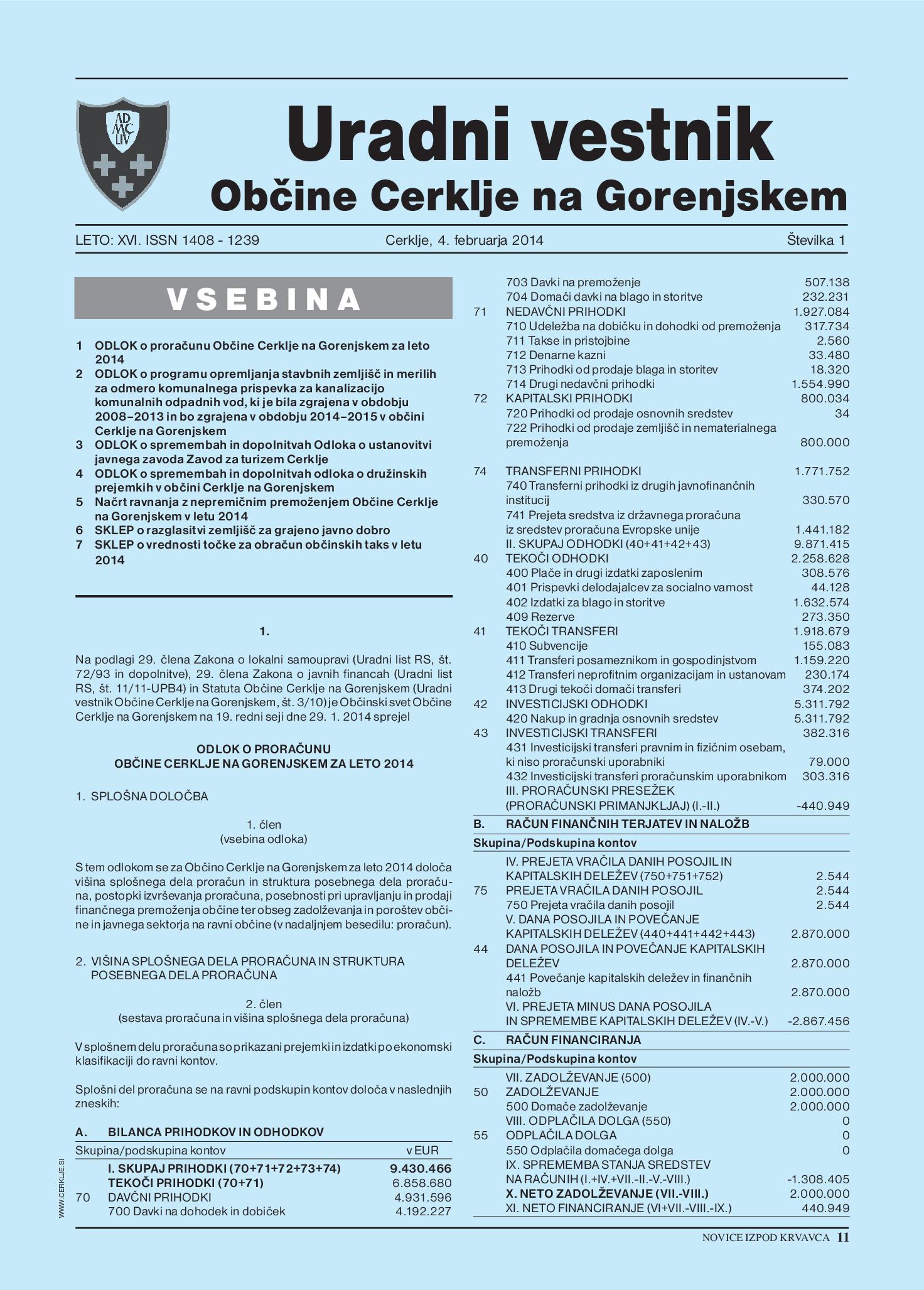 Odlok o proračunu Občine Cerklje na Gorenjskem za leto 2014 - UV občine Cerklje na Gor., št. 1/2014 (Uradni vestnik, Št. 1, 4. februar 2014)