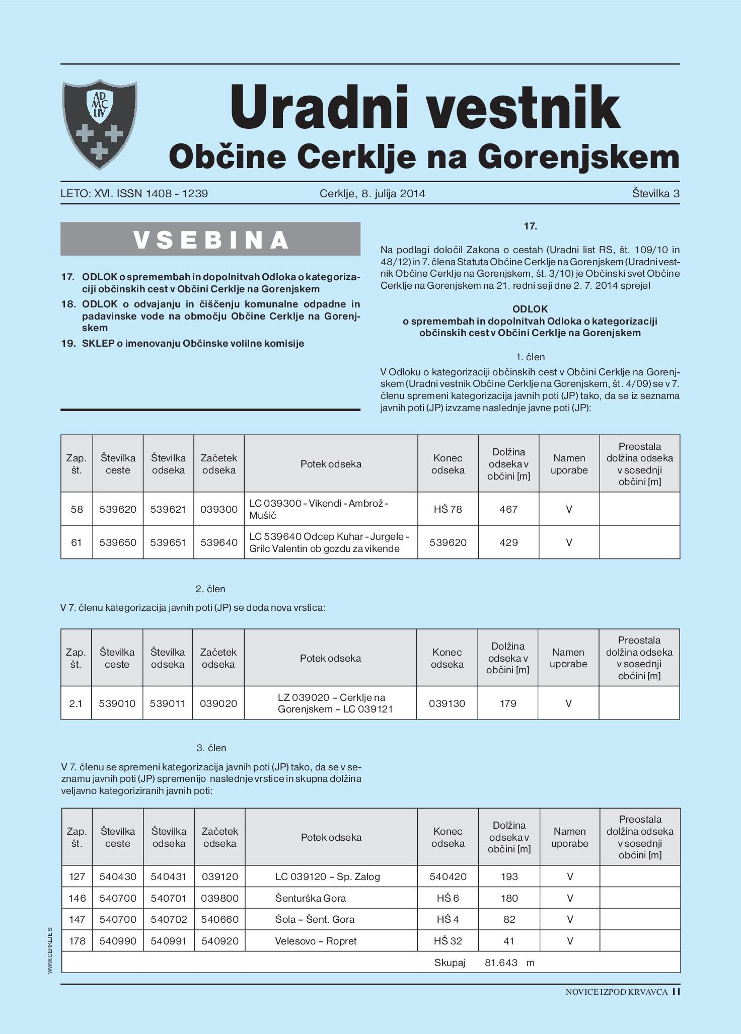 Odlok o spremembah in dopolnitvah Odloka o kategorizaciji občinskih cest v Občini Cerklje na Gorenjskem - UV občine Cerklje na Gor., št. 3/2014 (Uradni vestnik, Št. 3, 8. julij 2014)