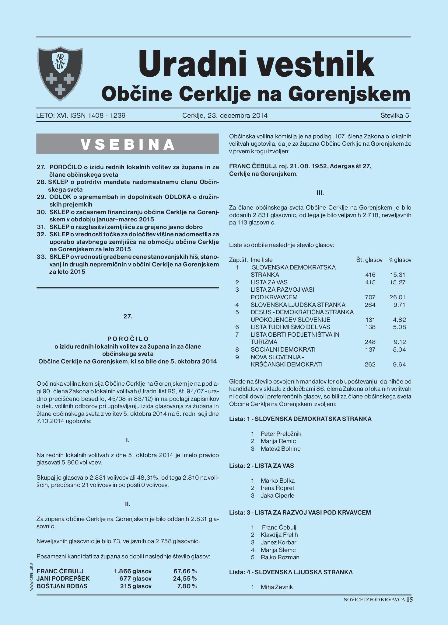 Poročilo o izidu rednih lokalnih volitev za župana in za člane občinskega sveta Občine Cerklje na Gorenjskem - UV občine Cerklje na Gor., št. 5/2014 (Uradni vestnik, Št. 5, 23. december 2014)