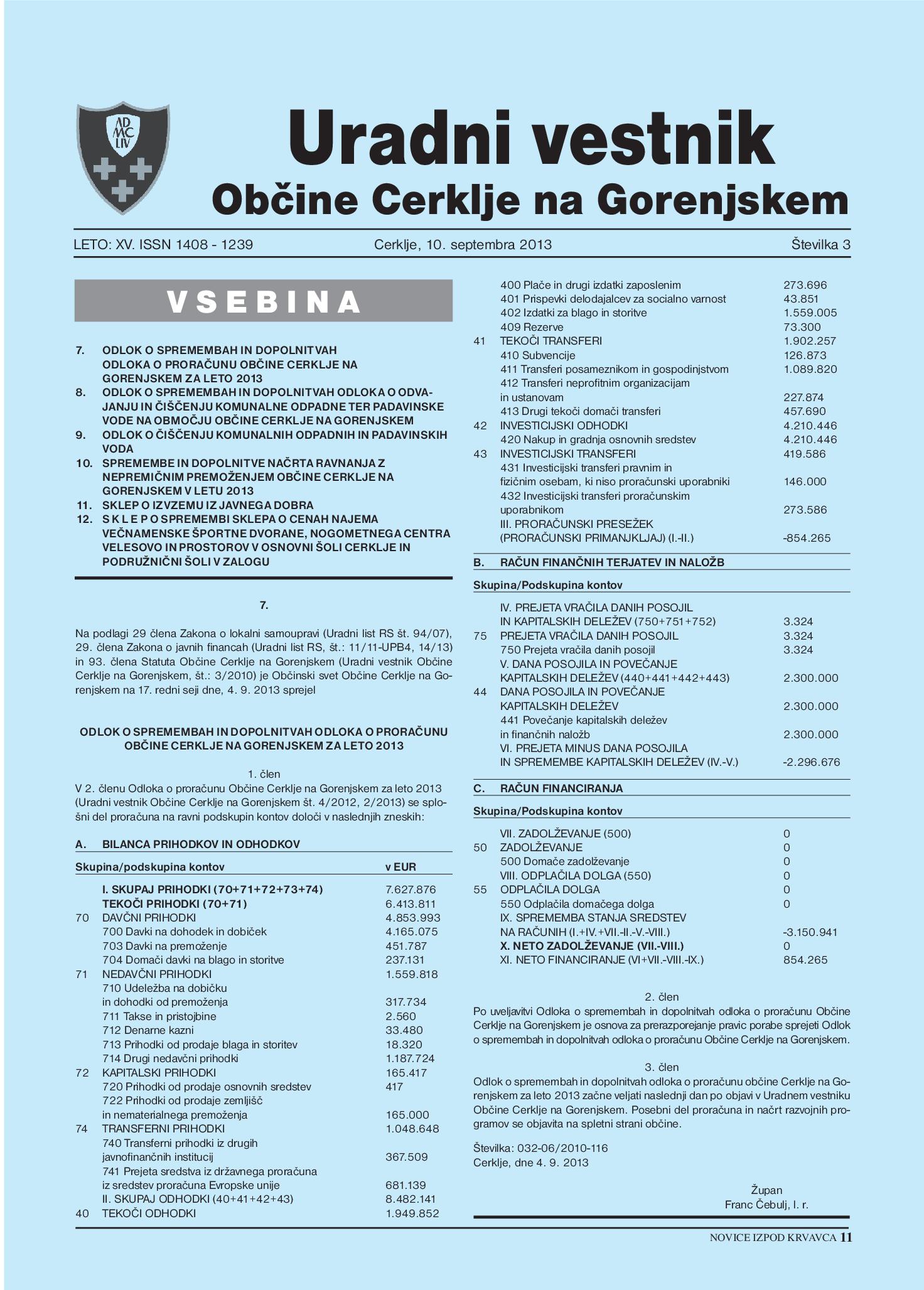 Odlok o spremembah in dopolnitvah Odloka o proračunu Občine Cerklje na Gorenjskem za leto 2013 - UV občine Cerklje na Gor., št. 3/2013 (Uradni vestnik, Št. 3, 10. september 2013)