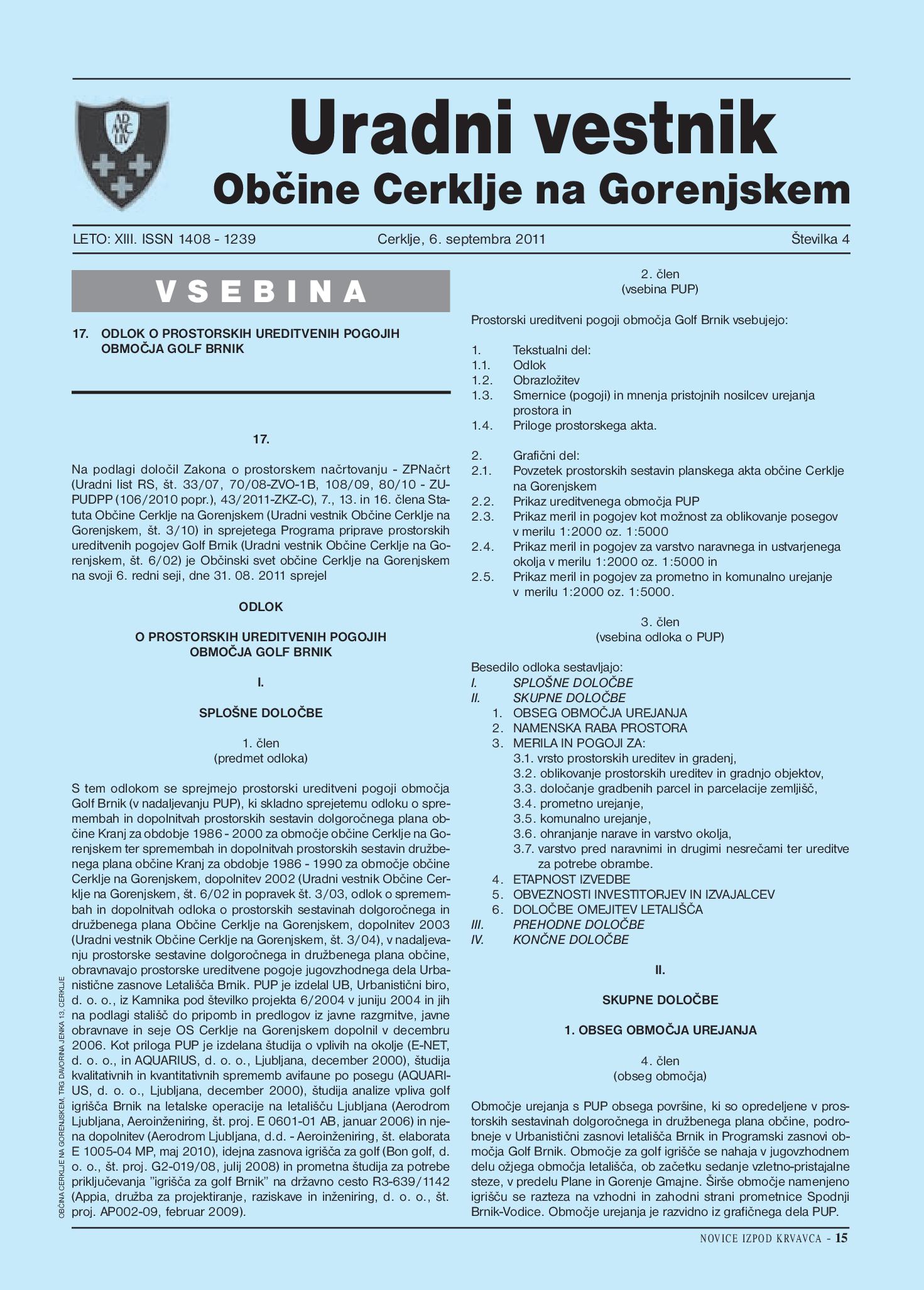 Odlok o prostorskih ureditvenih pogojih območja GOLF Brnik - UV Občine Cerklje na Gor., št. 4/2011 (Uradni vestnik, Št. 4, 6. september 2011)