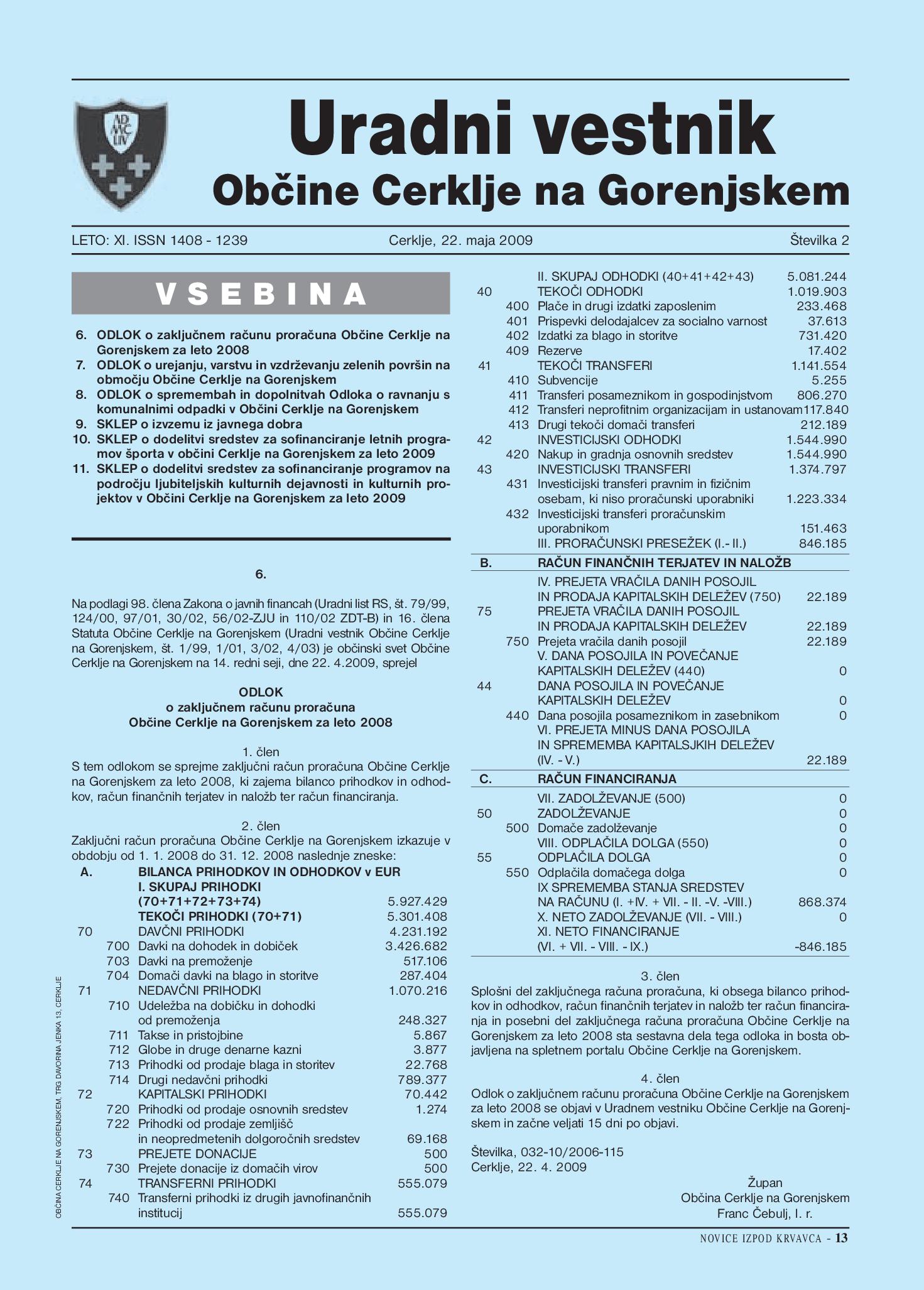 Odlok o zaključnem računu proračuna Občine Cerklje na Gorenjskem za leto 2008 - UV Občine Cerklje na Gor., št. 2/2009 (Uradni vestnik, Št. 2, 22. maj 2009)