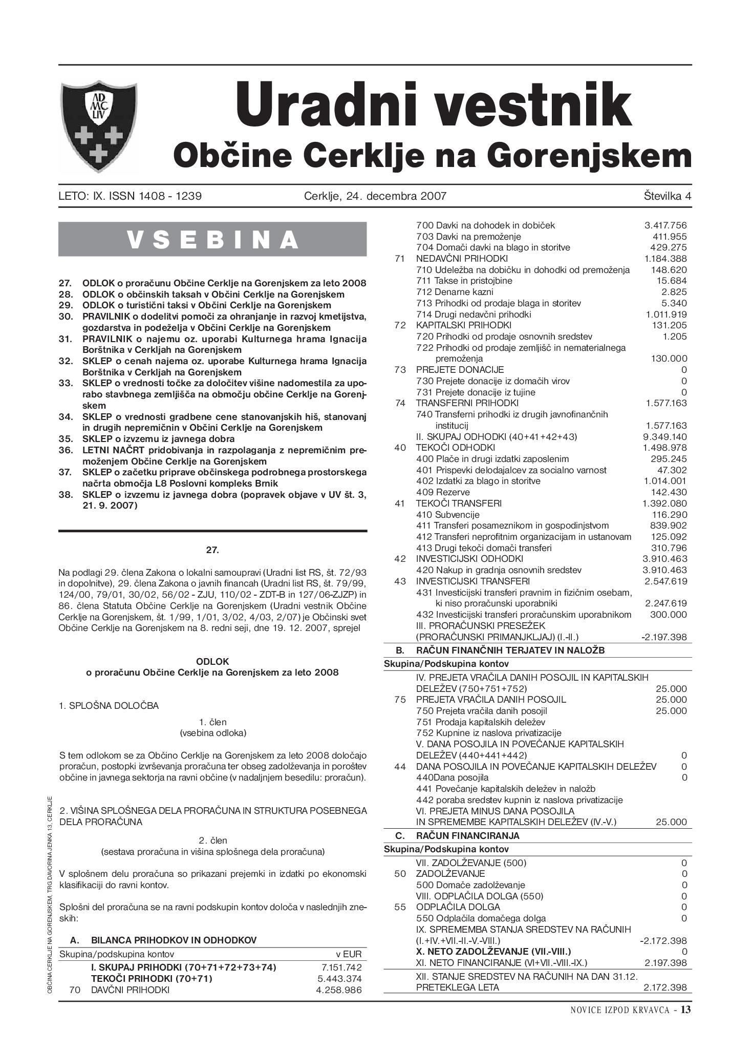 Odlok o proračunu občine Cerklje na Gorenjskem za leto 2008 - UV Občine Cerklje na Gor., št. 4/2007 (Uradni vestnik, Št. 4, 24. december 2007)