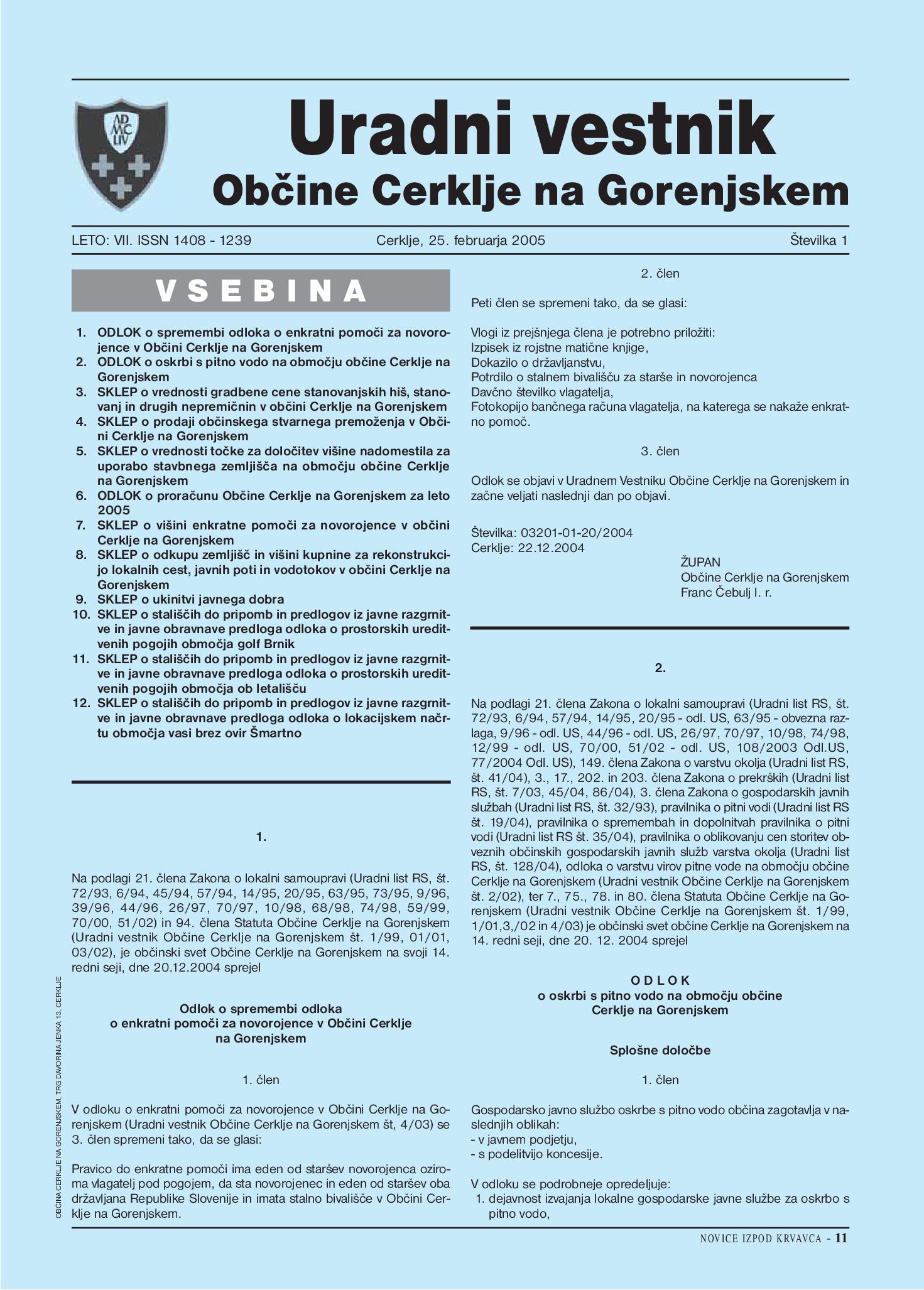 Odlok o oskrbi s pitno vodo na območju občine Cerklje na Gorenjskem - UV občine Cerklje na Gor., št. 1/2005 (Uradni vestnik, Št. 1, 25. februar 2005)