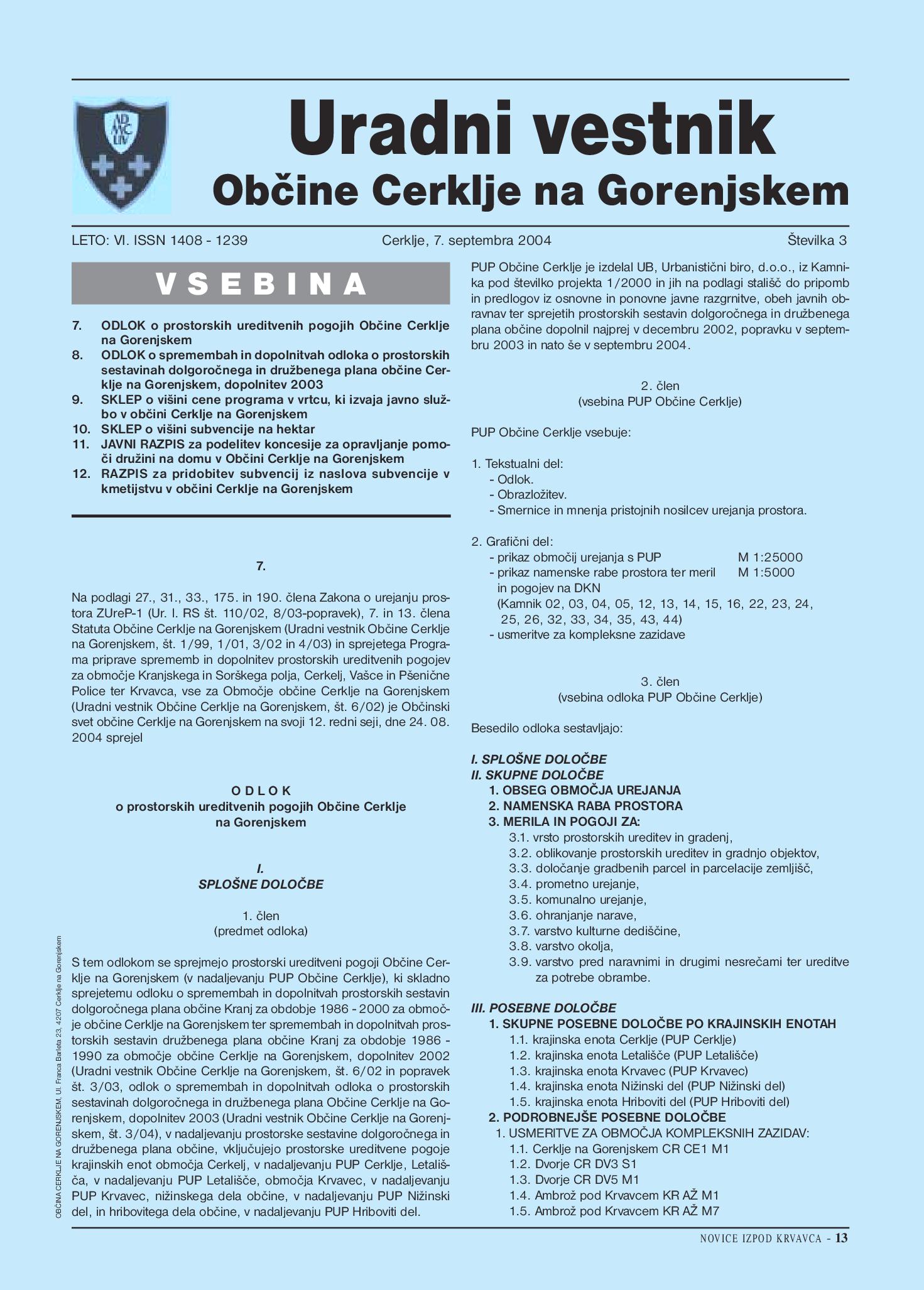 Odlok o prostorskih ureditvenih pogojih občine Cerklje na Gorenjskem -UV občine cerklje na Gor., št 3/2004 (Uradni vestnik, Št. 3, 7. september 2004)