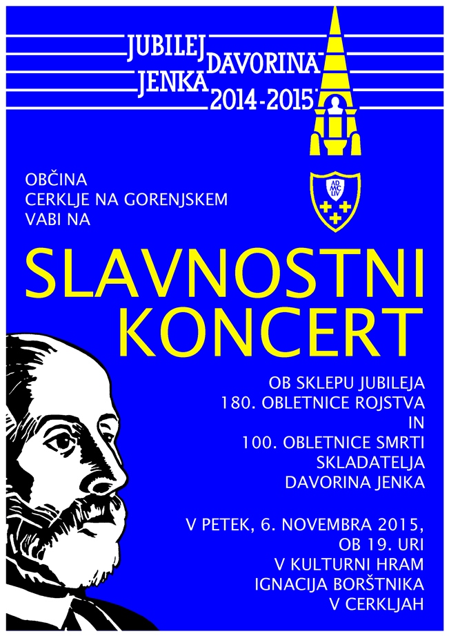 Občina Cerklje na Gorenjskem skupaj z Osnovno šolo Davorina Jenka Cerklje pripravlja Slavnostni koncert ob sklepu jubileja 180. obletnice rojstva (9.11.1835) in 100. obletnice smrti (25.11.1914) skladatelja in dirigenta Davorina Jenka. Prireditev bo v petek, 6. novembra 2015 ob 19. uri v Kulturnem hramu Ignacija Borštnika v Cerkljah. Slavnostni govornik bo ...