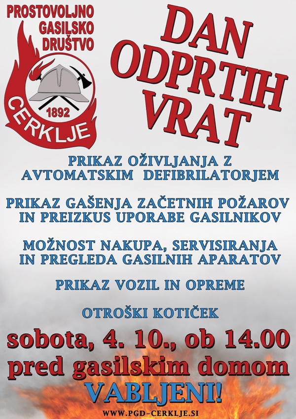 Gasilci PGD Cerklje v soboto, 4.10. 2014, od 14. ure dalje pripravljajo dan odprtih vrat za občane. Na dnevu odprtih vrat si boste lahko ogledali naša vozila, opremo in gasilski dom. Predstavili vam bodo delovanje prvih posredovalcev, temeljne postopke oživljanja in uporabo defibrilatorja. Poleg tega bo prikazano gašenje začetnih požarov, maščobna eksplozija in ravnanje z gorečo plinsko jeklenko. Obiskovalci bodo lahko sami preizkusili gašenje začetnih požarov z gasilniki in imeli tudi možnost nakupa, servisiranja in pregleda gasilnih aparatov. Pozabili niso niti na najmlajše, saj jih bodo v otroškem kotičku čakale pobarvanke in križanke, za nekaj trenutkov pa bodo lahko postali tudi pravi mali gasilci in se preizkusili v gasilskih igrah. Vabljeni!