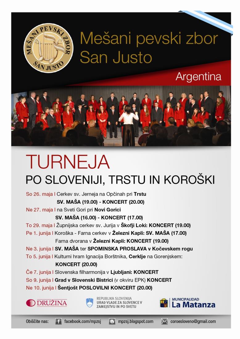 Ob tokratni turneji bodo nastopili v torek, 5. junija ob 20. uri tudi v Kulturnem hramu Ignacija Borštnika v Cerkljah in v četrtek, 7. junija v Slovenski filharmoniji v Ljubljani, peli pa bodo tudi na spravni maši v Kočevskem rogu, ki bo v nedeljo, 3. junija 2012. V soboto, 9. junija bodo zapeli na gradu v Slovenski Bistrici in nedeljo, 10. junija v Šentjoštu, kjer bodo imeli poslovilni koncert. Zapeli pa so že našim rojakom v Italiji, v Železni Kaplji v Avstriji pa bodo imeli koncert danes, v petek, 1. junija. Na koncertu se bodo predstavili s slovenskimi in argentinskimi pesmimi, med katerimi bo tudi znana Misa Criolla argentinskega skladatelja Ariela Ramireza. Zborovodkinja prof. Andrejka Selan Vombergar zbor vodi od leta 1992, pred tem pa ga je vodil njen oče Andrej Selan.