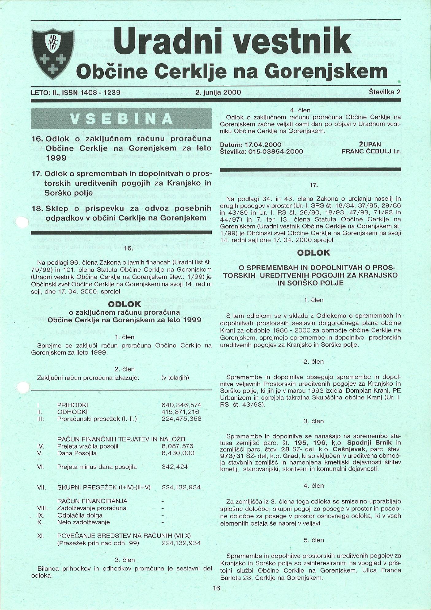 Odlok o zaključnem računu proračuna občine Cerklje na Gorenjskem za leto 1999 - UV občine Cerklje na Gor., št. 2/2000 (Uradni vestnik, Št. 2, 2. junij 2000)