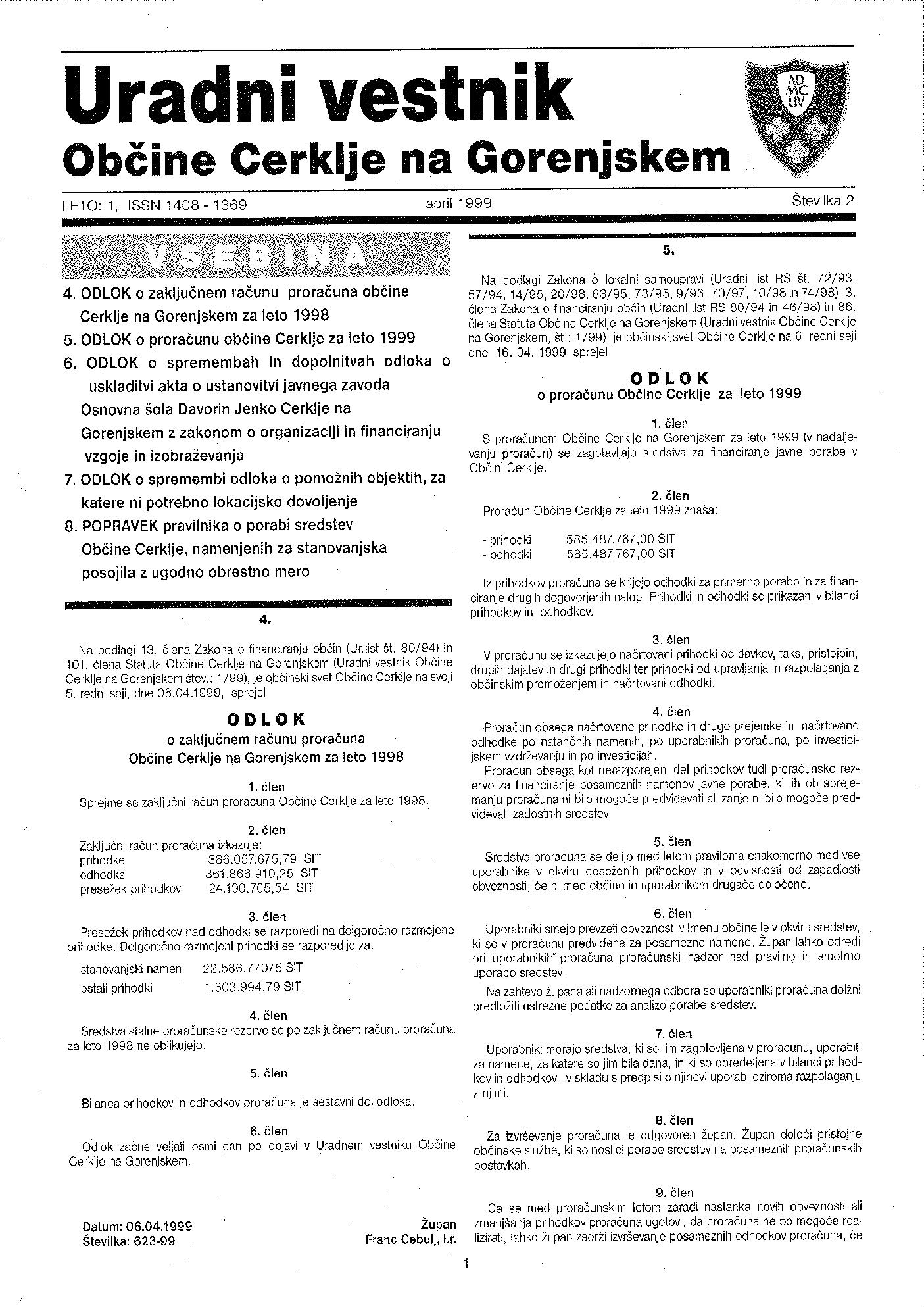 Odlok o proračunu občine Cerklje za leto 1999 – UV občine Cerklje na Gor., št. 2/1999 (Uradni vestnik, Št. 2, april 1999)