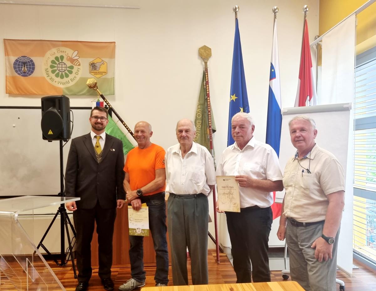 Na sliki z leve proti desni: Anže Perčič predsednik Čebelarske zveze Gorenjske, Stanko Bohinc, Janez Kocijančič, župan občine Cerklje Franc Čebulj in podpredsednik ČZG Lovro Legat. Foto: Tanja Magdič