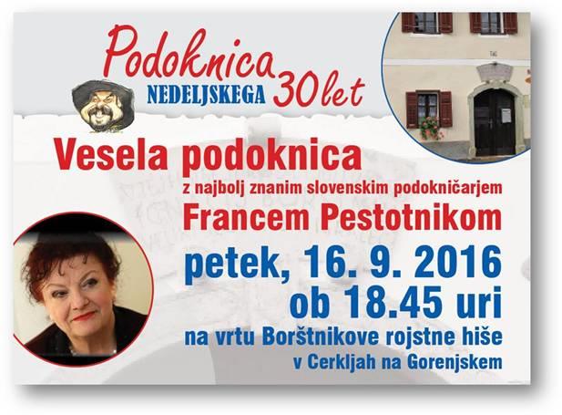 Kulturno društvo Ignacija Borštnika v sodelovanju z Zavodom za turizem Cerklje, Kulturnim klubom Liberius Cerklje in drugimi partnerji z ekipo Nedeljskega dnevnika pripravlja Veselo podoknico z najbolj znanim slovenskim podokničarjem Francem Pestotnikom.
