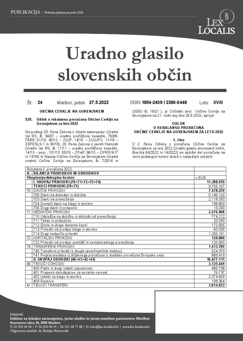 Odlok o rebalansu proračuna Občine Cerklje na Gorenjskem za leto 2022 (24/2022) (Uradno glasilo slovenskih občin, št. 24, 27.05.2022)