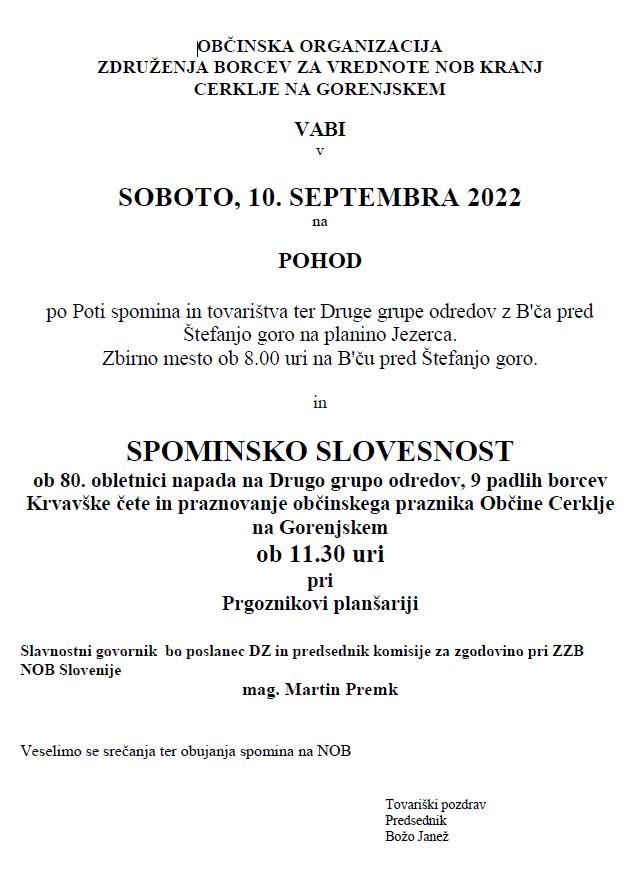 Pohod in Spominska slovesnost ob 80. obletnici napada na Drugo grupo odredov, 10.9.2022