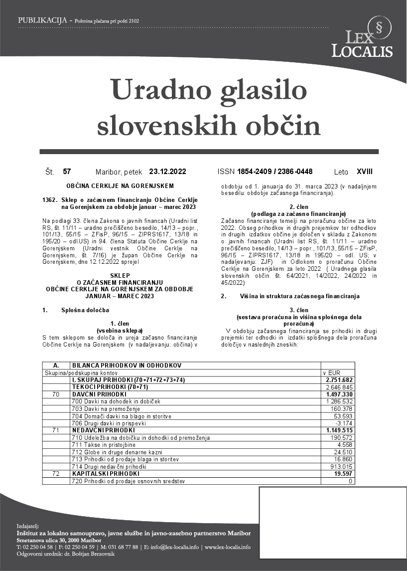 Sklep o začasnem financiranju Občine Cerklje na Gorenjskem za obdobje januar – marec 2023 (57/2022) (Uradno glasilo slovenskih občin št. 57, 23.12.2022)