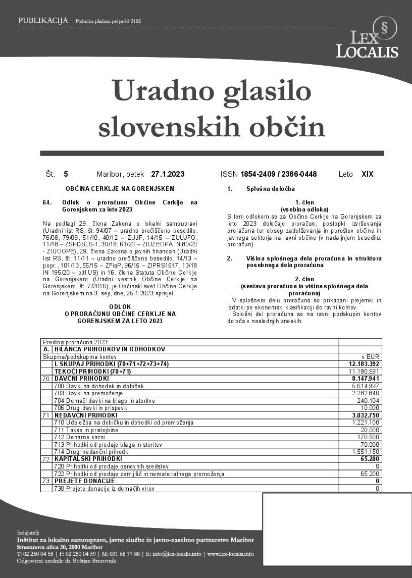 Odlok o proračunu Občine Cerklje na Gorenjskem za leto 2023 (5/2023) (Uradno glasilo slovenskih občin št. 5, 27.01.2023)