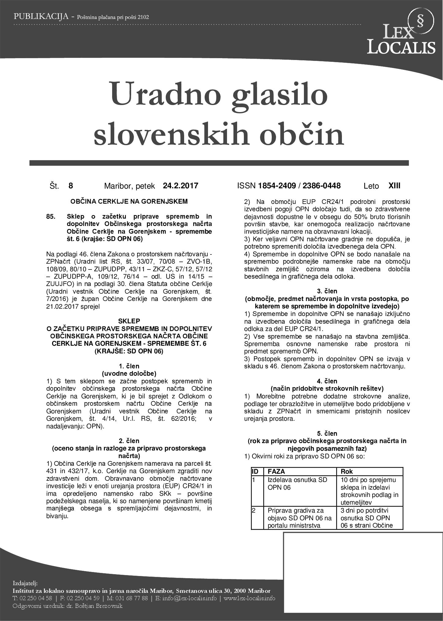 Sklep o začetku priprave sprememb in dopolnitev Občinskega prostorskega načrta Občine Cerklje na Gorenjskem – spremembe št. 6 (8/2017) (Uradno glasilo slovenskih občin, Št. 8, 24. februar 2017)