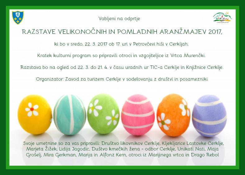 Zavod za turizem Cerklje v sodelovanju z društvi in posamezniki pripravlja tradicionalno Razstavo velikonočnih in pomladnih aranžmajev 2017. Otvoritev razstave bo v sredo, 22. marca ob 17. uri. Program ob otvoritvi so pripravili otroci in vzgojiteljice iz Vrtca Murenčki. Razstava bo na ogled od 22. marca do 21. aprila 2017 v Petrovčevi hiši v Cerkljah v času uradnih ur Turistično informacijskega centra Cerklje in Knjižnice Cerklje.