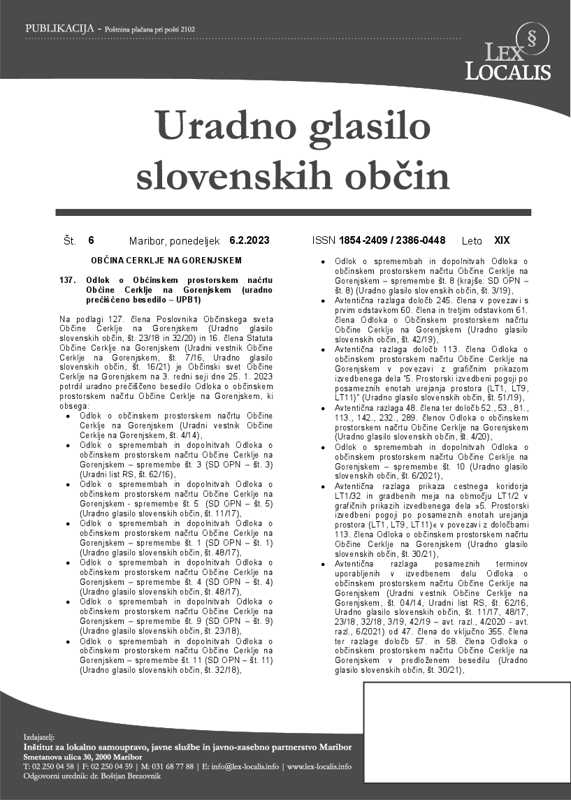 Odlok o Občinskem prostorskem načrtu Občine Cerklje na Gorenjskem (6/2023) (uradno prečiščeno besedilo - UPB1) (Uradno glasilo slovenskih občin št. 6, 06.02.2023)