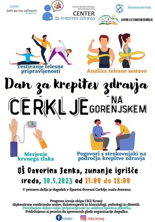 Center za krepitev zdravja Kranj bo v Občini Cerklje na Gorenjskem pred Osnovno šolo Davorina Jenka Cerklje, 10. maja 2023 od 15.00 do 18.00 ure, tradicionalno, že tretjič po vrsti, izvedel DAN ZA KREPITEV ZDRAVJA.