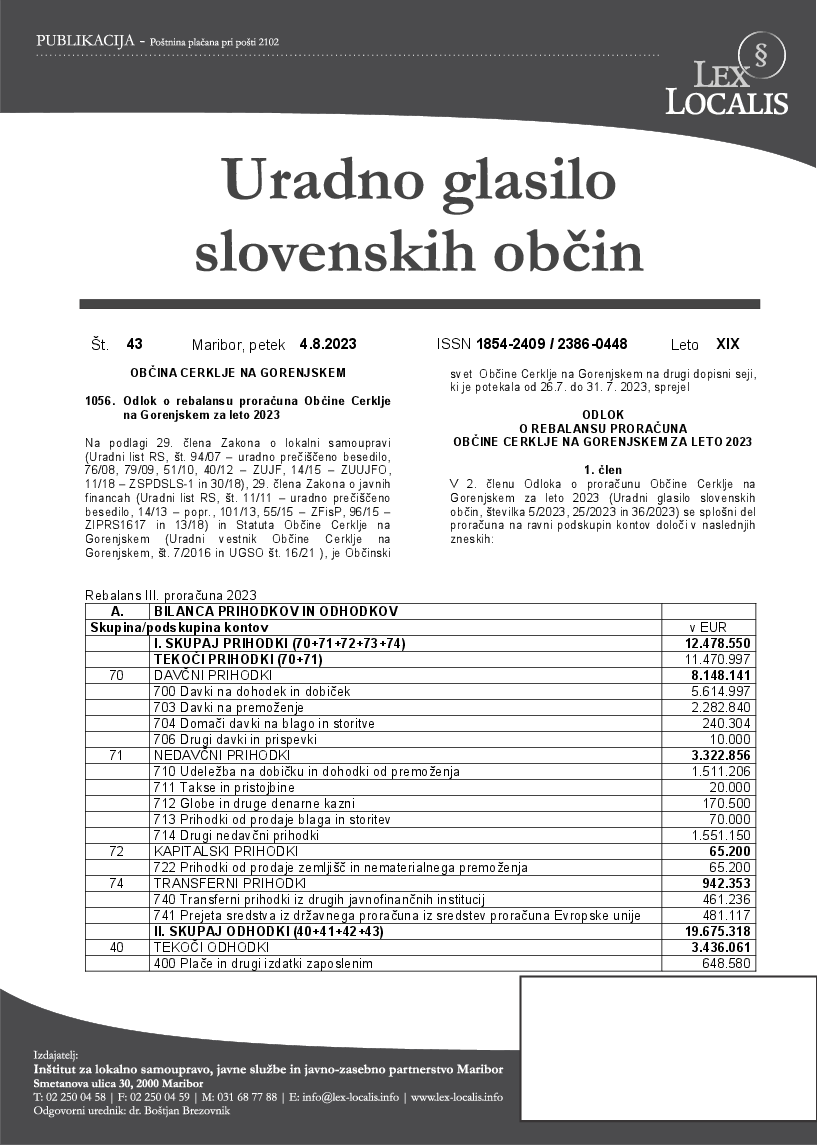 Odlok o rebalansu proračuna Občine Cerklje na Gorenjskem za leto 2023 (43/2023) (Uradno glasilo slovenskih občin št. 43, 4. 8. 2023)