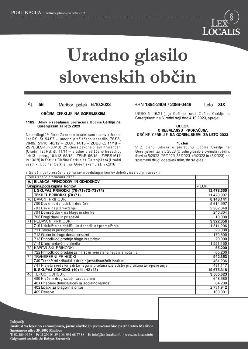 Odlok o rebalansu proračuna Občine Cerklje na Gorenjskem za leto 2023 (56/2023) (Uradno glasilo slovenskih občin št. 56, 06.10.2023)