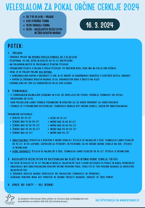 Društvo obrtnikov in podjetnikov Cerklje vabi na tradicionalni smučarski dan na Krvavcu, ko se v veleslalomu med seboj pomerimo občani Cerkelj, tudi otroci, podjetniki in njihovi zaposleni ter tudi naše vaške skupnosti.