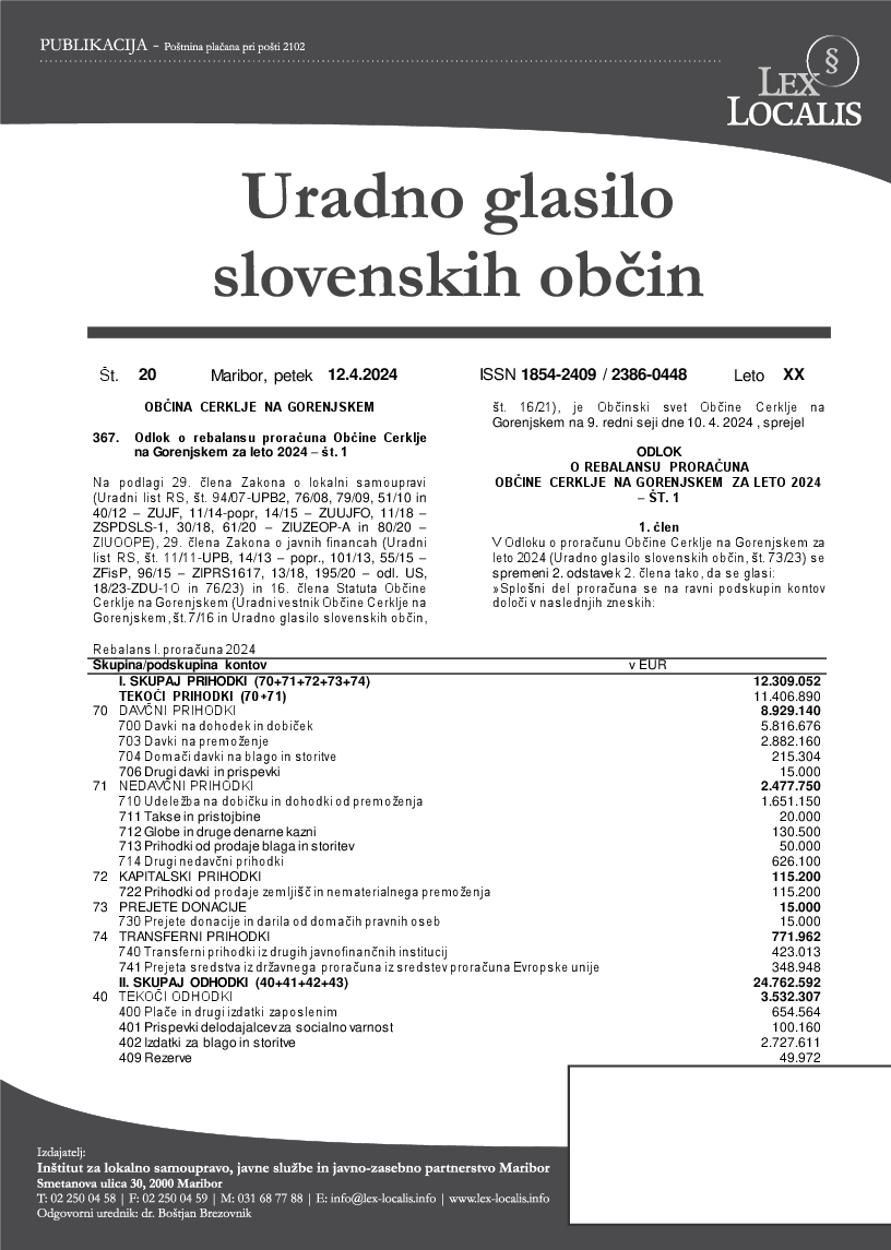 Odlok o rebalansu proračuna Občine Cerklje na Gorenjskem za leto 2024 – št. 1 (20/2024) (Uradno glasilo slovenskih občin št. 20, 12.04.2024)